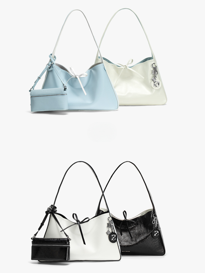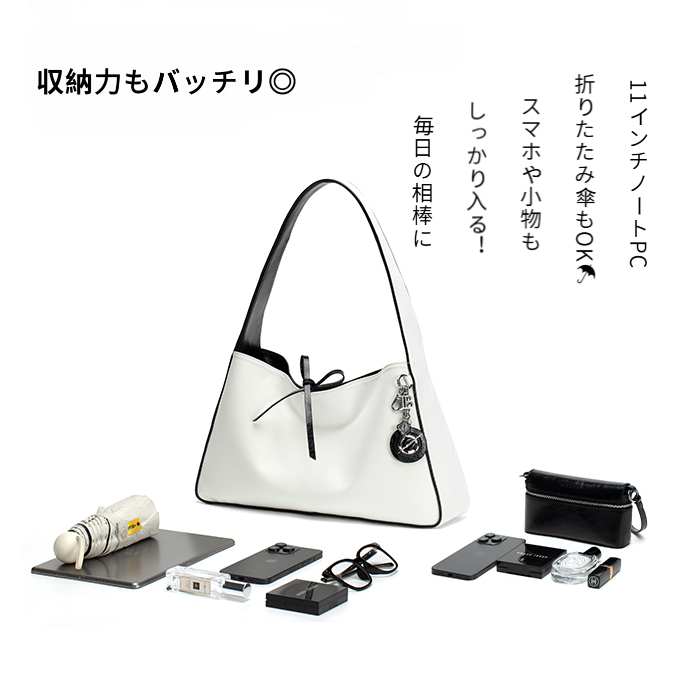 大サイズバッグは11インチのノートPC、折りたたみ傘、化粧品、財布などをしっかり収納。ミニポーチにはスマホや鍵、小物がすっきり収まります。