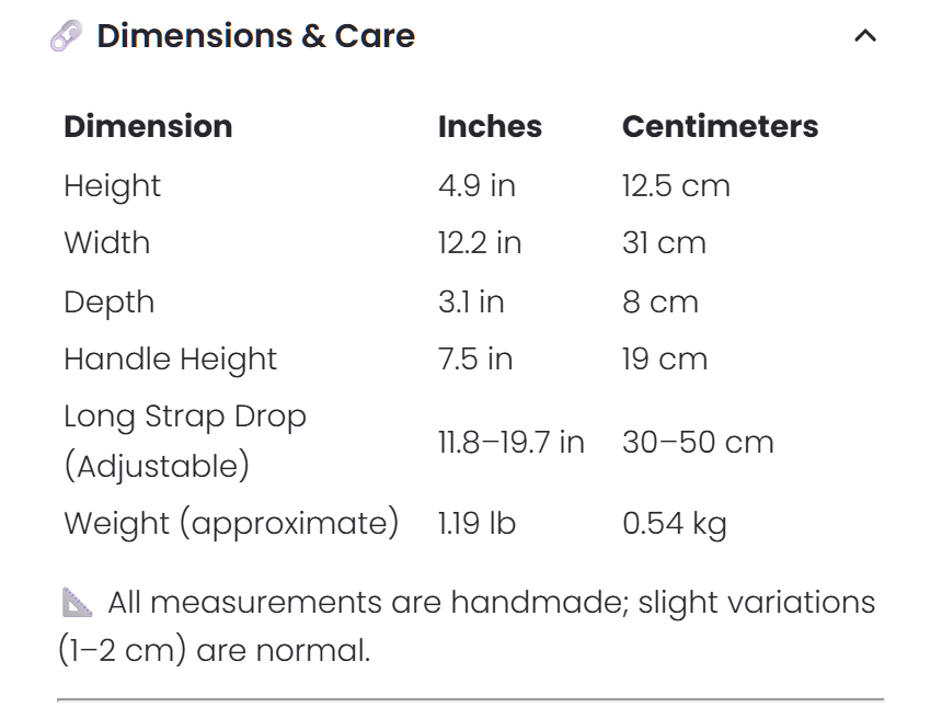 📐 All measurements are handmade; slight variations (1–2 cm) are normal.